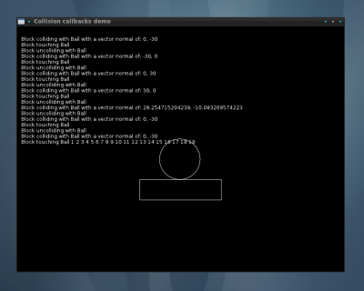 Say we want to print to screen whenever a callback is called. We just need to modify the text variable we added to love.load() earlier by appending a string every time a collision action happens. We need a bit of extra code to keep the output clean too.